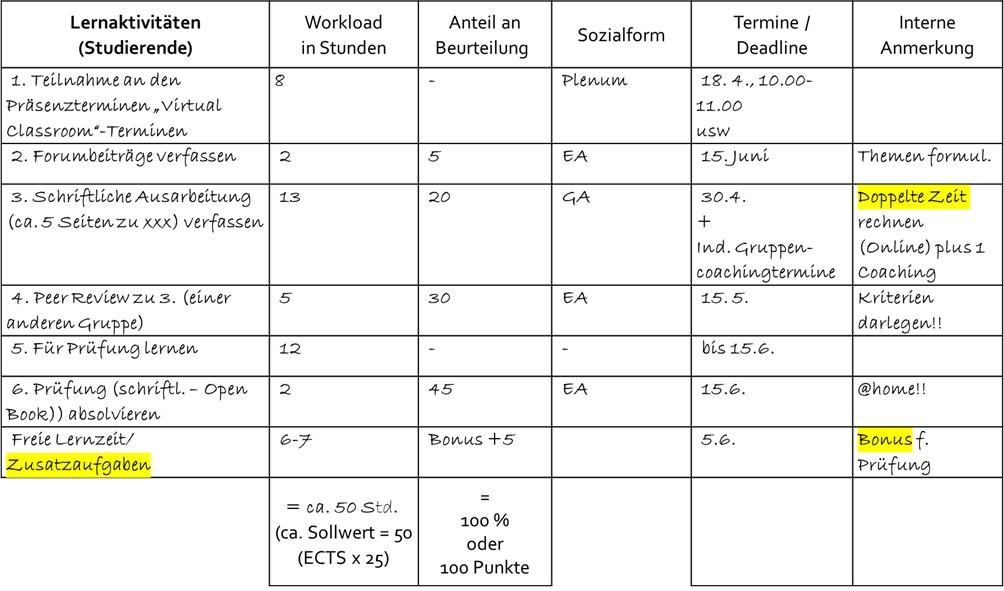 Das Modulhandbuch des jeweiligen Studiengangs liefert bei der LV- Planung die grundlegenden Vorgaben für die Erstellung des Syllabus Der Syllabus ist die auf das konkrete Semester bezogene Konkretisierung wesentlicher Bestandteile der LV, wie Ort, Zeit, Anwesenheitsvorgaben, Lernergebnisse, Ziele, Inhalte, Leistungsbeurteilung und Lernaktivitäten sowie Materialien. Er wird zu LV-Beginn mit den Studierenden besprochen.